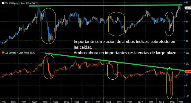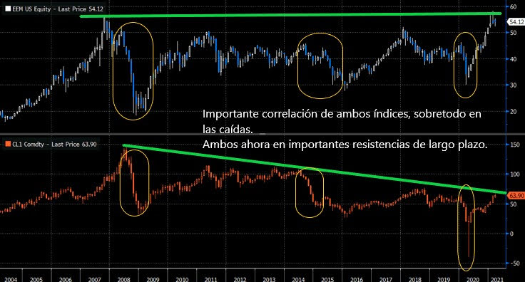 Volviendo un poco al presente y analizando técnicamente unos mercados que llevan un importante subida últimamente. Durante los últimos 20 años, la renta variable emergente y el petróleo han experimentado numerosas subidas y bajadas en los mismos periodos: ambos tocaron máximos en 2008 para retroceder después cerca del -60%, y nuevamente tocaron zona de máximos en 2014 para retroceder después -40%. Ahora mismo tenemos a ambos índices en importantes resistencias: el ETF de emergentes en zona de máximos históricos del 2007, y el petróleo que se enfrente a la resistencia de la directriz bajista que mantiene desde los máximos de 2008. Hacia donde se dirijan a partir de ahora estos índices, es un importante mensaje para la inflación y los tipos de interés. Y una ruptura de resistencias en ambos sería una apuesta clara por la renta variable emergente y los valores energéticos.